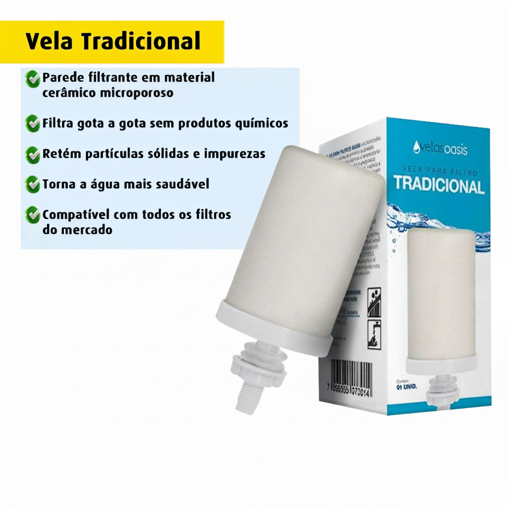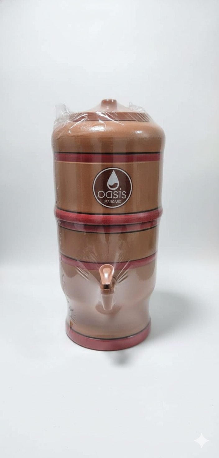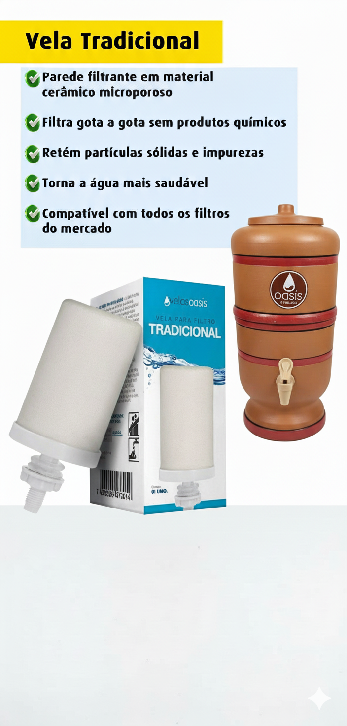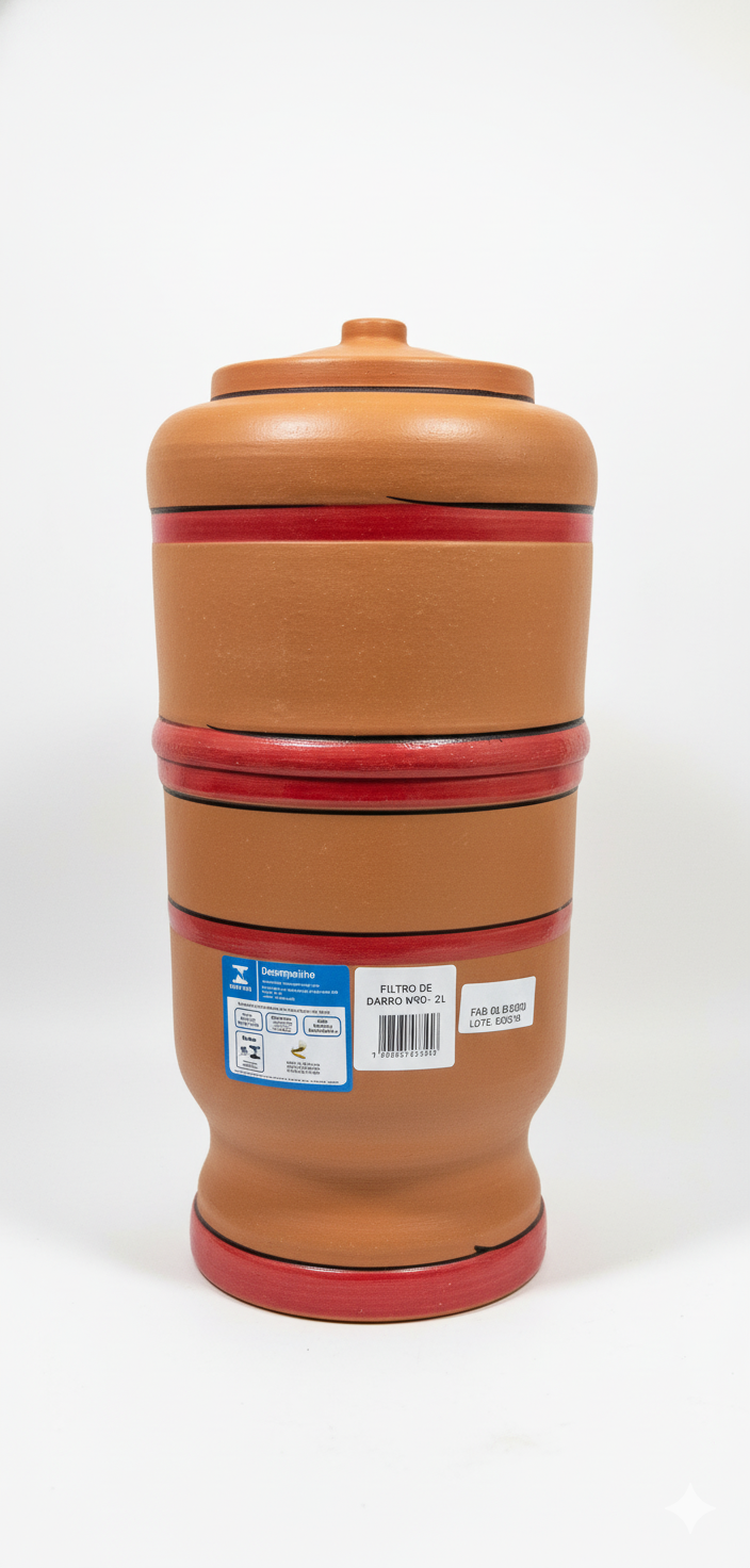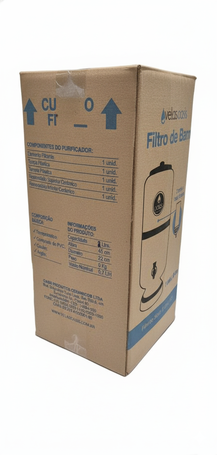 Filtro de Barro água Fresca nº 00 – 2 Litros com 1 vela é a escolha ideal para quem busca água pura, fresca e saudável no dia a dia. Com capacidade de 2 litros, ele é compacto, prático e conta com a vela de cerâmica tripla ação, que garante água limpa e de qualidade superior. ✔️ Capacidade: 2 Litros ✔️ Filtragem eficiente: vela cerâmica que retém partículas de até 5 μm ✔️ Durabilidade: cada vela filtra até 500 litros de água ✔️ Qualidade testada: atende à norma ABNT NBR 16098 ✔️ Praticidade: não precisa de energia elétrica ✔️ Design compacto: ideal para cozinhas pequenas, escritórios e uso diário ⚙️ Informações Técnicas Marca: Oasis Modelo: Tradicional nº 00 Capacidade: 2 Litros Composição básica: Polipropileno (PP), Poliestireno (PS), PVC, TPE Sistema de filtragem: Vela Cerâmica Tradicional Tripla Ação Vazão nominal: até 60 litros/dia Eficiência bacteriológica: ≥ 99,9% Redução de cloro livre: ≥ 75% Redução de partículas: ≥ 85% para partículas de 5 μm Temperatura de uso: 5°C a 45°C Pressão de trabalho: até 3 kgf/cm² Durabilidade da vela: até 500 litros filtrados (ou 6 meses de uso) Registro ABNT: NBR 16098 ✅ Benefícios: Água limpa, fresca e natural sem uso de energia elétrica. Filtro compacto e econômico. Alta retenção de impurezas, odores e sabor desagradável da água. Marca tradicional e confiável no Brasil.
